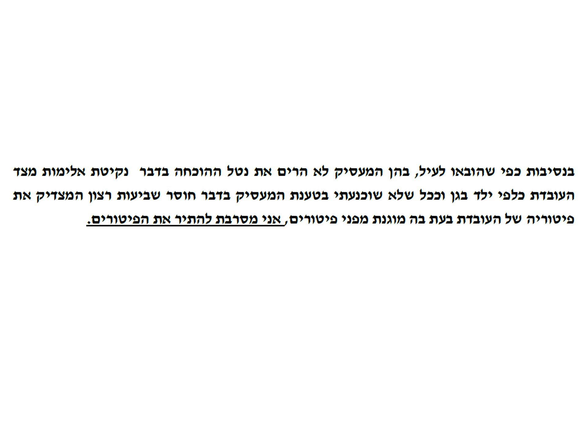 בהליך שייצג משרדנו עובדת בבקשה למתן היתר לפיטורי אישה בהריון, טענה המעסיקה טענות מוכחשות של אי שביעות רצון והפעלת אלימות מצד העובדת וזאת בכדי לקבל היתר לפיטורי העובדת עוד במהלך תקופת הריונה, משרד העבודה - מינהל הסדרה ואכיפה דחה את בקשתם וקיבל את טענותינו הצודקות וקבע שאין להתיר את פיטוריה של העובדת.